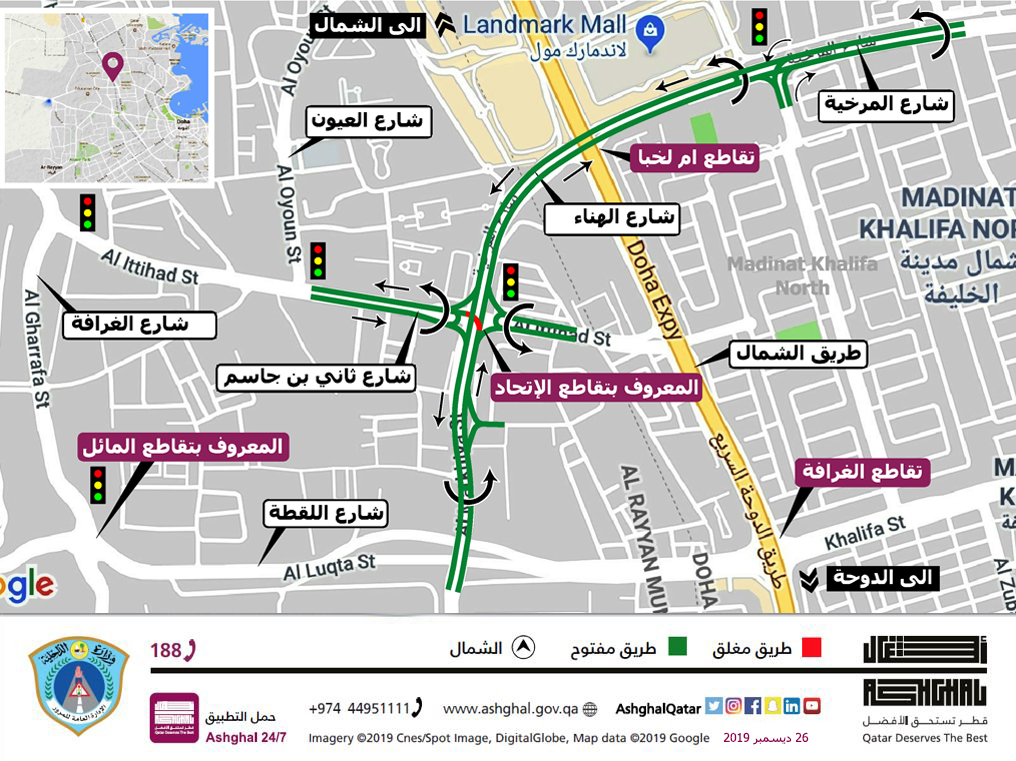 تعلن هيئة الأشغال العامة “أشغال” عن إغلاق الحركة المرورية القادمة من شارع الهناء في اتجاه شارع ثاني بن جاسم بمنطقة الغرافة اعتبارا من السبت 28 ديسمبر 2019 ولمدة ثمانية أشهر بهدف استكمال أعمال تطوير التقاطع في المنطقة.
