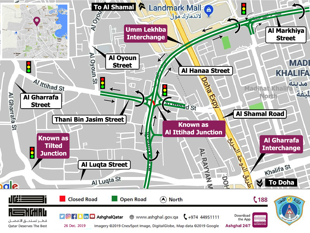 The Public Works Authority ‘Ashghal’ announces the closure of traffic coming from Al Hanaa Street towards Thani Bin Jasim Street in Al Gharrafa on Saturday, December 28, 2019 for a period of eight months to complete the work of developing the intersection in the area.